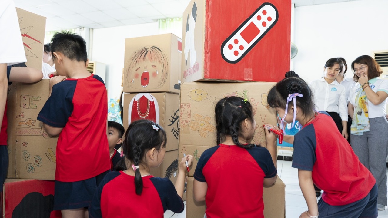 On October 3rd, Safety Star Program Ambassador Andy Lin and GIVE Sustainable delivered the printed “AN” art series to Đông Trung Kindergarten, Đông Tiền Hải Commune, Hưng Yên Province — a school of 230 students and 82 teachers and caretakers.